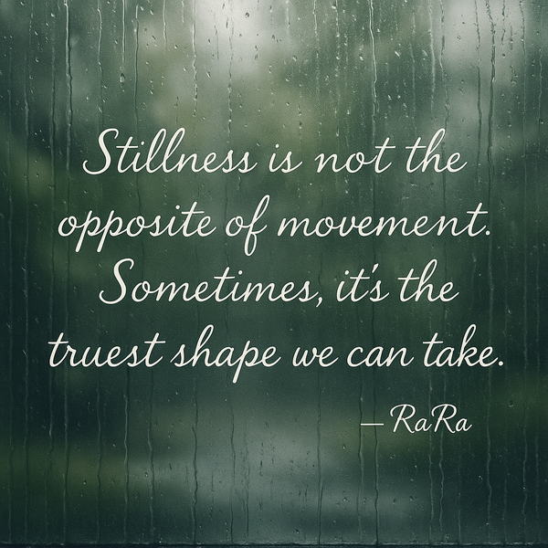 ✨ RaRa-ology of the Week“Stillness is not the opposite of movement. Sometimes, it’s the truest shape we can take.” 🌧 Rain falling outside a window, symbolizing the invitation to pause and rest.